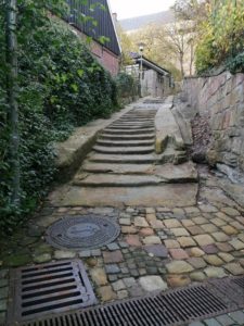 Op de foto staat een eeuwenoude trap, de synagogetrap. Het is een van de weinige overblijfselen van een joodse synagoge. Op deze locatie stond de voormalige synagoge van Bentheim. Een gedenksteen, naast de trap, net niet op de foto, is opgericht in 1985 door Pastor H.J. Smidt. Bovenaan een gedenkkastje met foto’s en tekst staat: