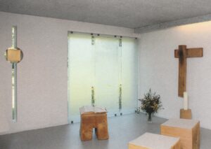 De sfeer van deze plek wordt als het ware “verlicht” door vensters van opaalglas. Weliswaar kan men niet door de vensters kijken, maar men krijgt wel een vermoeden van het licht aan de andere zijde, dat ons eens veel krachtiger zal worden gegeven. De veensoldaten leggen hiervan al getuigenis af in het laatste couplet van hun lied. Aan de zijwand hangt een groot eenvoudig kruis met korte dwarsbalk. De kunstenaar schrijft: “In de dikke eik, waaruit de plank gezaagd werd, is de termijn van 60 jaar na de oorlog slechts een handbreed en is deze korte dwarsbalk een onvolgroeide tak met granaatinslag van 1944/1945. Dit kruisteken hangt als een wig met het licht vergroeid. Deze wond is genezen en gaf het kruis zijn vorm”.