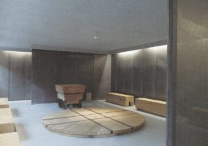 Het licht in deze ruimte is bewust indirect en diffuus. Hier voelt men wat gevangenschap voor velen heeft betekend en hier krijgt men tevens stof tot nadenken over hoe verraderlijk het toen was en ook nu nog kan zijn. De beeldhouwer legde midden in de ruimte een spoorwissel. Rails van vroegere treinen door het veen doorkruisen een kruisvormig platvorm van eikenhout. Op deze rails werd destijds de, door de gevangenen gestoken turf, naar de verzamelplaats getransporteerd. De kruisvormige wissel stelt zowel een oud als een nieuw spoor voor. Destijds leidde dit naar een verschrikkelijk, onmenselijk doel. Nu echter leidt het naar hedendaagse mensen, die hier iets leren en hun nieuwe kennis kunnen uitdragen. In deze ruimte is ook het altaar in de vorm van een turflorrie. De verroeste wielen zijn oude relikwieën van de spoorweg in het veen. Zoals vroegchristelijke altaren op de graven van de martelaren geplaatst werden, zo doet dit altaar denken aan het folterwerktuig van de veensoldaten.